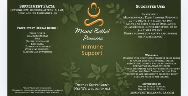 Immune Support is a lovingly crafted herbal tincture blending elderflower, sage, and echinacea. These time-honored botanicals work in harmony to support your body’s natural defenses and promote seasonal wellness.